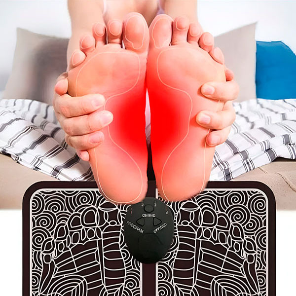 Coloque los pies descalzos sobre la almohadilla de silicona del estimulador. El masajeador comienza a emitir impulsos eléctricos de baja frecuencia que estimulan los músculos de las piernas, los relajan y les proporcionan un agradable masaje.